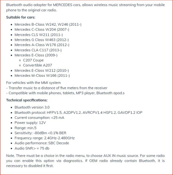 Adapteri kaabel, käed-vabad süsteem MB Bluetooth Audio Adapter Mercedes CONNECTS2
